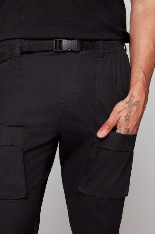 Restez élégant et fonctionnel avec le pantalon cargo TRAVIS en popeline extensible noir. Équipé de poches cargo latérales, de poches au niveau des genoux et d’un ourlet ajustable, il combine design robuste et polyvalence au quotidien. Le cordon fonctionnel à la taille assure un maintien parfait, tandis que la popeline extensible offre confort et durabilité. Une pièce utilitaire intemporelle en finition noire.